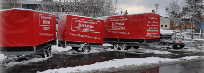 Wir vermieten an Tankstellen Anhänger mit Plane für Möbel und saubere Ladung, von 750 kg bis 2000 kg zulässiges Gesamtgewicht und mit einer Nutzlast von 500kg bis 1350kg.